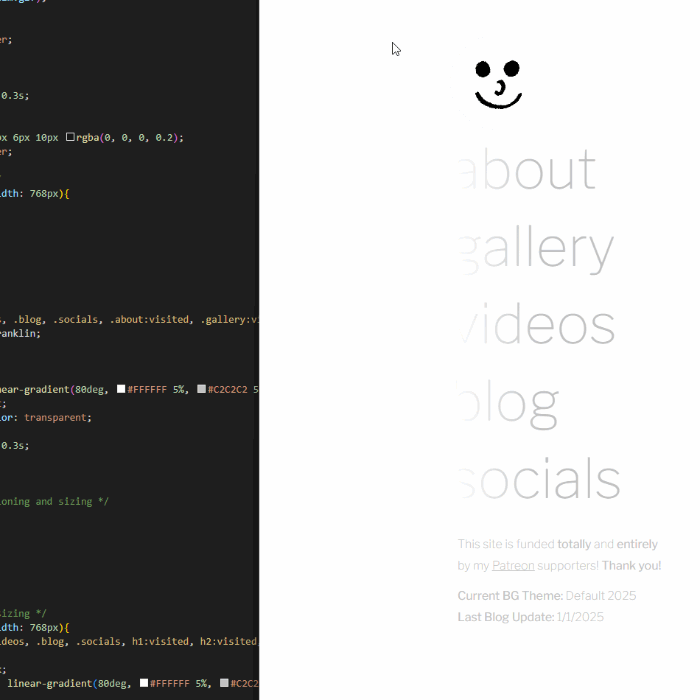 Besides the odd gallery update, updates to this site have been a little slow lately! I've was busy with Art Fight and IRL stuff this summer. But! There is still some stuff in the oven right now.Lately, I've been learning HTML and CSS cause I've wanted to redesign this site for a while now. I think it's servicable, but there's a lot I'd like to change. So, I've started working on it!I'm only barely getting started, but so far, I'm pleased with how progress is going. I may share some further updates on my socials as I make more progress, but if this website seems a little static for a bit, that's why.I hope to share more about the redesign soon! You can read more about some of it below on a thread I posted on deskGen.net :)